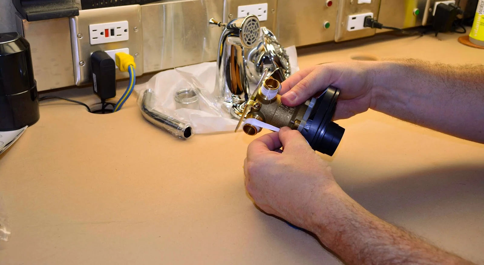 I started the prep work by neatly wrapping all four of the valve's threaded inlets with teflon tape. (IN: hot (left) and cold (right) OUT: Tub (down) and Shower(up))