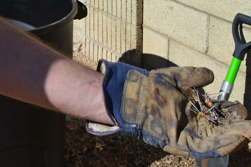 When I say, "piles of brush", I mean piles of dried cactus chunks with huge, sharp spines. We'd lost a massive saguaro cactus months ago, and I'd left piles of it to dry out. These spines are huge, tough needles that were able to pierce my leather work boot and my foot when I first started the clean up. That was an adventure.
