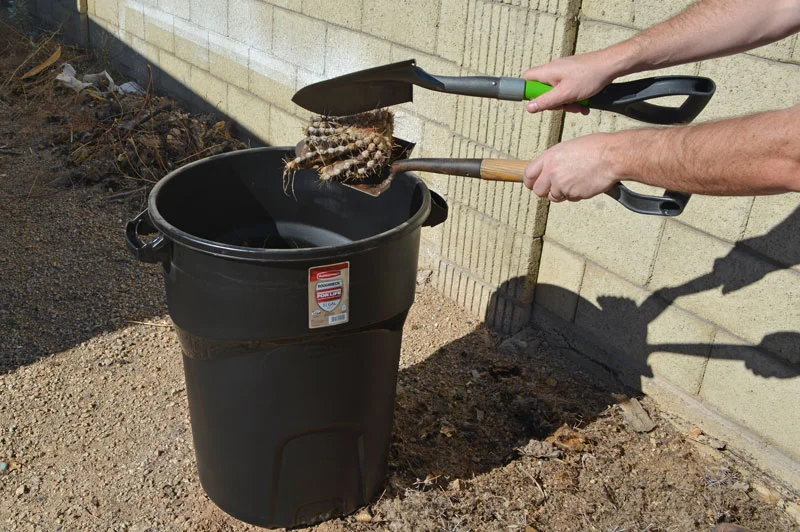 When I tried to fill trash bags, the spines shredded them; I couldn't get the pieces deep in the bag. It was a frustrating exercise. I needed something tougher to get it out to the curb, something that wouldn't let spines poke through and pierce my tender flesh. I picked up a 32 gallon, Rubbermaid Roughneck , indoor / outdoor trash can from The Home Depot.