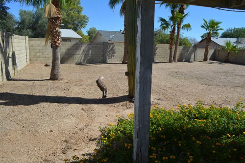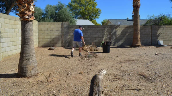 I quickly filled the trash can with the first of many loads of razor sharp cactus, flame-dried weeds, palm tree fronds (also with sharp spines), and sticks.