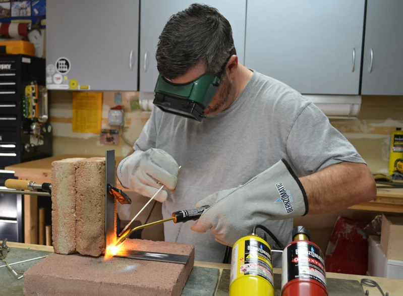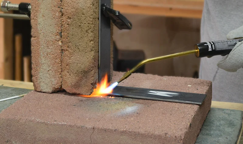 With the torch still blasting, I slid a Bernzomatic Brass Brazing Rod alongside the flame and ran it along the red hot steel. It took a little fiddling and some extra heat, but I got the feel for the process. I dabbed that brazing rod along the corner letting it melt as I kept the fire on.
