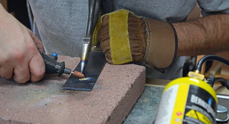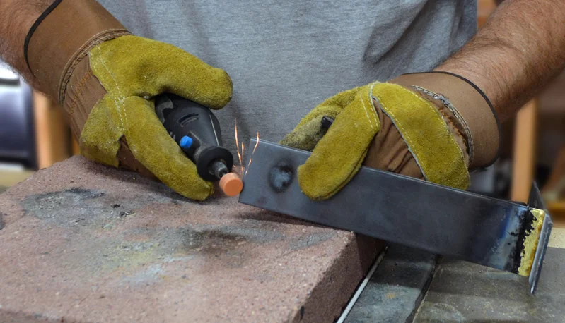After a bit of cooling, I switched to a lighter glove and swapped the welding goggles for safety glasses. I put a grinding tip in my rotary tool and smoothed the brazed areas a little bit. I feathered a chunky edge or two, smoothing it into the bar stock.