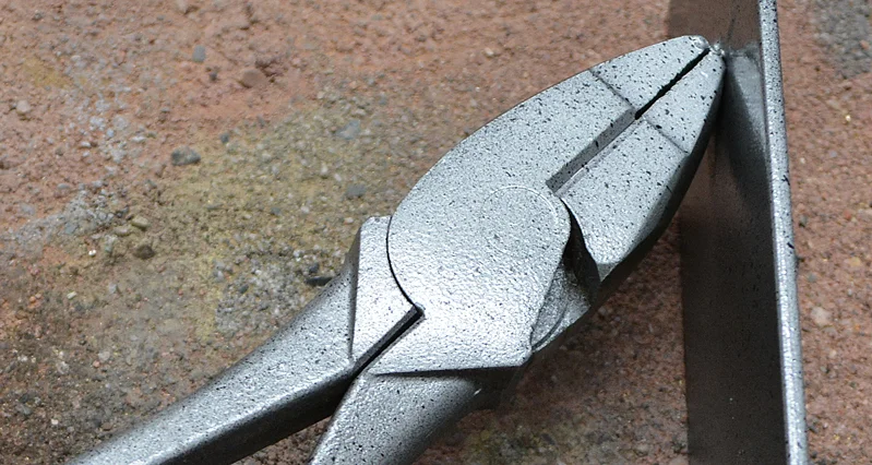 I cut the rubber handle covers off, sanded the mating area, and braced a pair of needle nose with the heavy bricks. I was really surprised how quickly I was able to heat the tool steel. I think it was because the heat was focused on a smaller area, unlike the wide bar stock that had a big surface to dissipate my heat. This little union was quick and easy. Within a few moments, I removed the bricks and tacked the tip of the handle down as well.