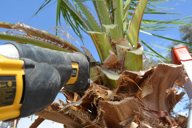I can get close enough to reach the top with my reciprocating saw on the small to medium size trees. That rascal rips through palm fronds like a hungry shark, much faster than the pole saw. No extension cord and none of that constant refilling of the chain saw bar-oil either.