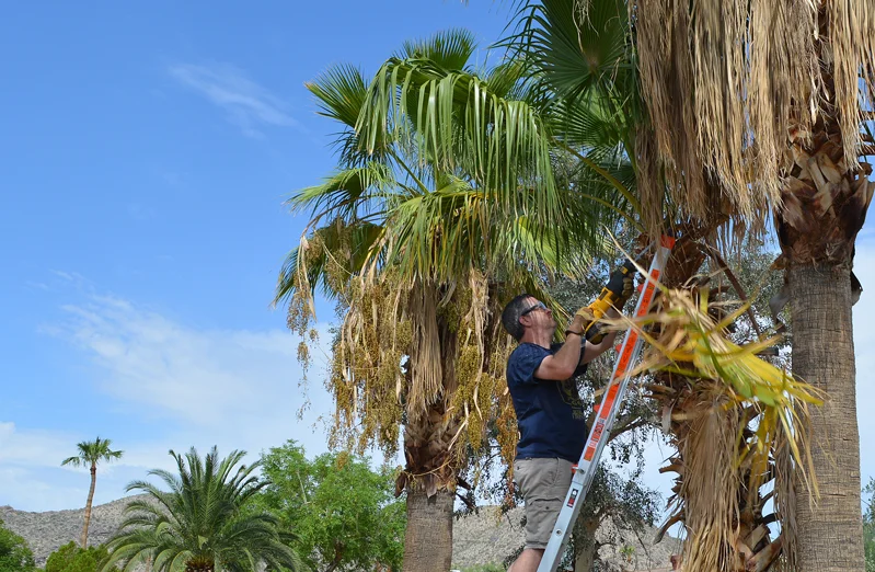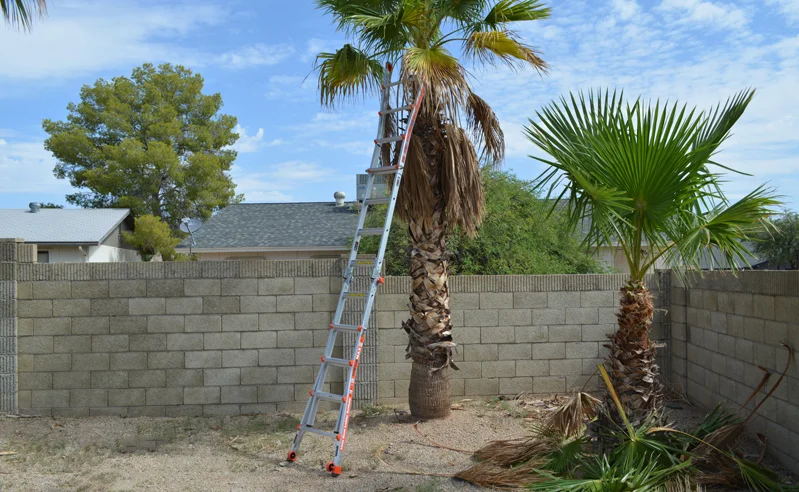 It was not my first time into man-to-palm combat, but this time around I had a secret weapon. I shifted from my normal approach of perching on a wobbly, 10 foot tall, fiberglass step ladder to battle with an electric pole saw. I now have a sturdy, convertible, 24-in-1 ladder which transforms into a 17 foot extension ladder. I can now face my opponent directly.