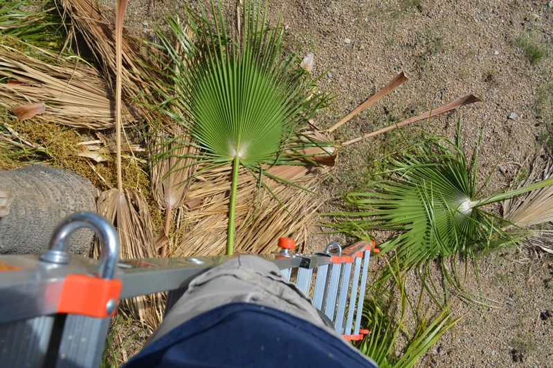 I loved the stability from the wide stance base of my new ladder. I scampered up and sliced fronds like butter. Heaps of them sailed to the earth around the tree.