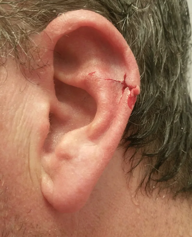 I took a shower and cleaned it up. I got it to pretty much stop bleeding. Oddly, it still didn't hurt, but there were some big flaps and chunks of meat hanging on there. You can't see it in the photo, but the edge of my ear below "X" mark folds open like a book. Super fun!