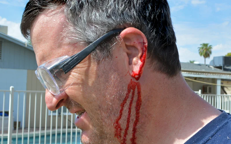 It still didn't hurt much, but the blood was pouring. By the time I got to the house and called for paper towels, I looked like a walking homicide victim. My poor wife gasped and her eyes bulged when I appeared bloody at the back door, looking like I'd managed to cut my throat out.