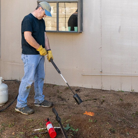 I decided to clean the area up a bit more, and hopefully kill any seeds or sprouts in the soil. It’s been a while since I brought out the big fire-beast, but what better time to use a flame-thrower than after a good dose of bushwhacking