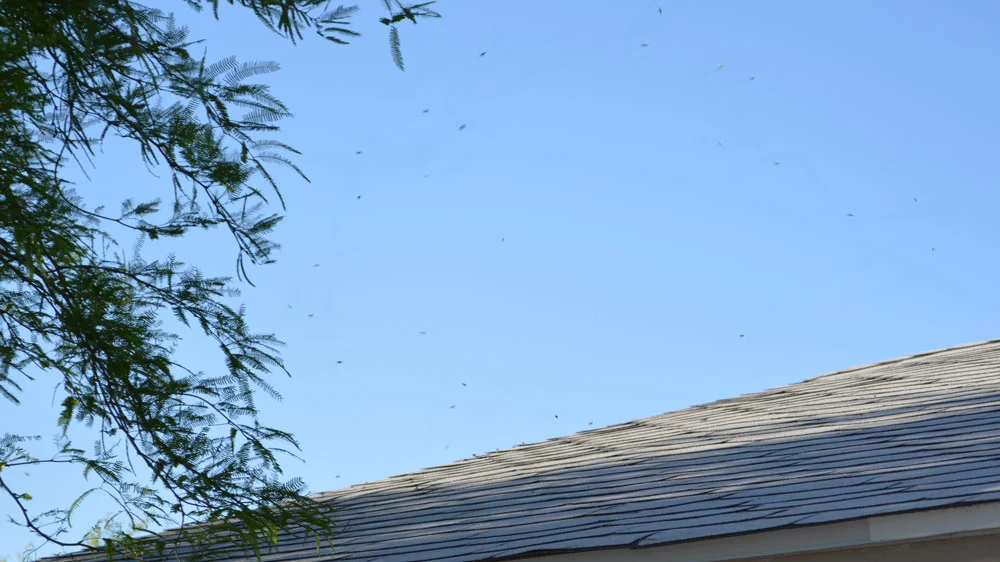 Though the widows, we watched the swarm drop in altitude. It extended from ground level, to the edge of the roof. After a few moments, it started to get more dense and move away from the doorway, towards the end of the house. I ventured out through the garage door and peeked around the corner.
