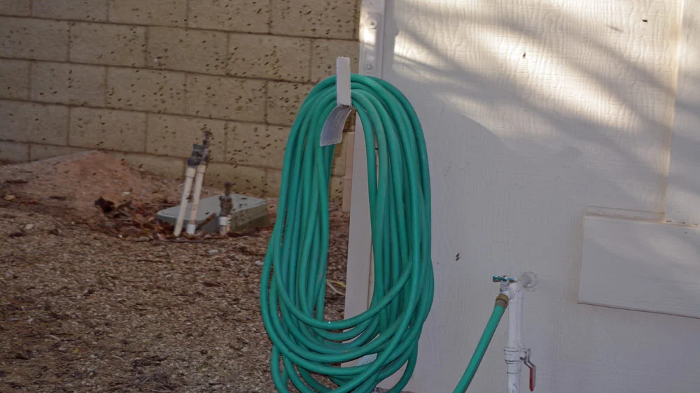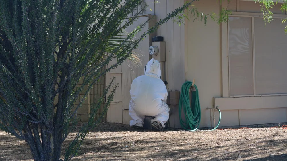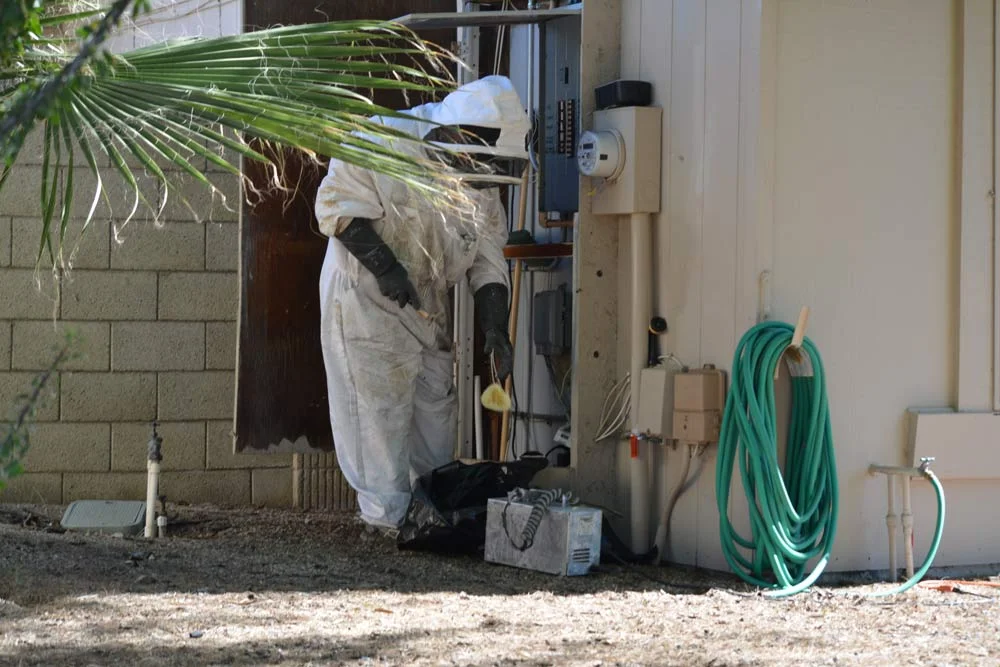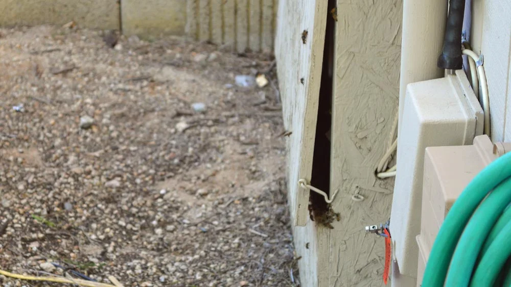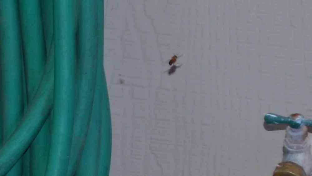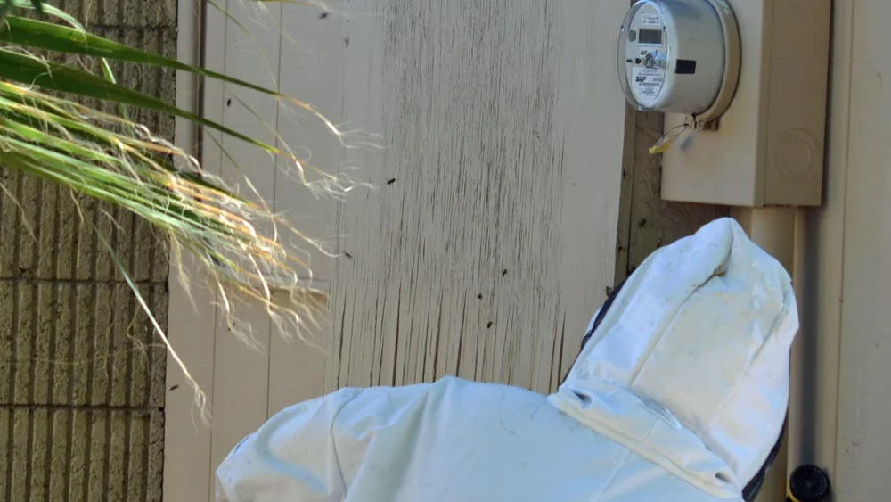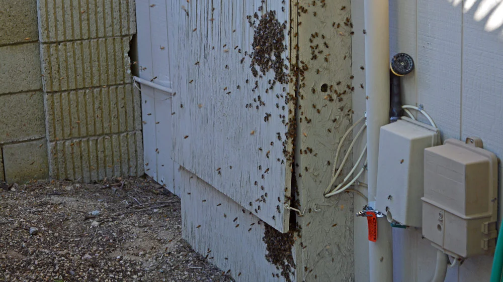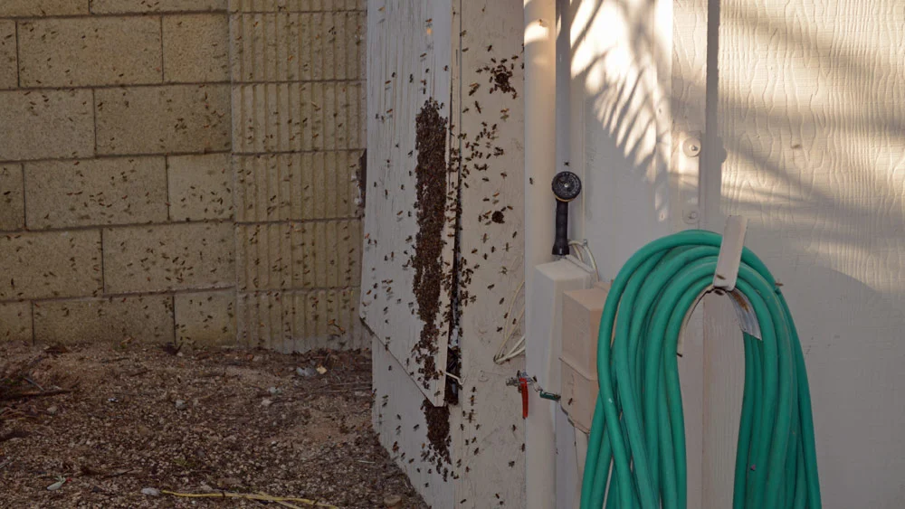 Around the corner is an ugly wooden enclosure that surrounds our electrical panel, sprinkler controls, and cable / telephone splices. The swarm collected and condensed on it as they started creeping inside.